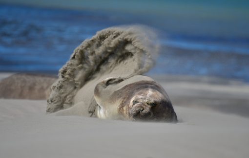 Each year between February and April small nurseries of baby sea lions play in the shallow surf close to the beach. They are very young, just learning how to swim and unaware of danger. Even their mothers are slow to warn and protect them when the orcas begin the approach. A giant dorsal fin breaks the surface in the hunting channel. Again and again, the orca swims back and forth waiting for inexperienced young pups to approach the surf. With its echolocation skills the orca scans the shallow water and receives a detailed picture of what is going on beneath the surface. It also possesses the ability to determine whether the prey is an adult animal or a juvenile. The chances of capturing an adult sea lion are less than 20%, whereas catching younger animals offers a chance of more than 50%. Which is why instead of wasting energy on chasing experienced and fast seals, the orca rather concentrates on the less challenging young pups. The whale positions itself while waiting for the right wave to emerge. The timing has to be right and then everything happens in the blink of an eye… The dorsal fin appears again, cutting through the water. As the wave rolls back we can see the whale with its whole body lying on the beach. In the mouth there dithers a seal pub which is stunned by the orca with three or four strokes on the water. Then the whale waits for the next waves to come which bring it back into the deep water. Those are the most dramatic moments for the best shots. Often, after catching a pup, the orcas teach their calves this hunting strategy. This is also a part of the life of an orca and if we are lucky we will be able to take pictures of this situation.